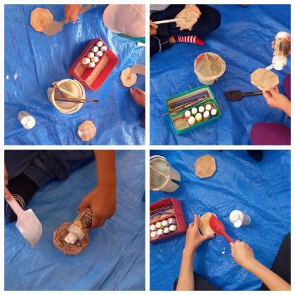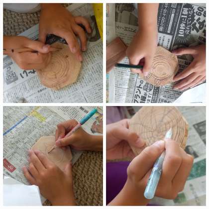 その後、コースターの上にシーラーを直接おとして筆で素早くシーラーを塗ります。