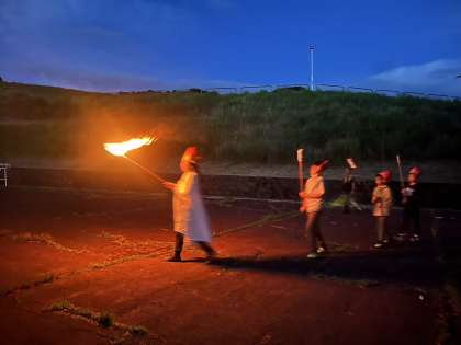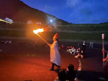 瓜破東小学校の仲間たちが集っているところへ、キャンプファイヤーのために神聖なる火を与えに『火の神』と『火の神の子どもたち』が登場しました。