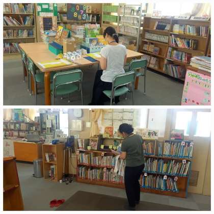 図書ボランティアの方と主幹学校司書が、本の修理など図書室の整備をすすめています。