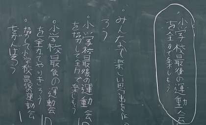 6年生の教室をのぞくと、子ども達が小学生生活最後の運動会に向けて、クラスのスローガンを考えています。