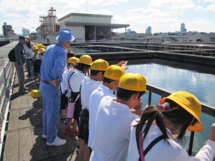淀川かわ取水されたばかりで、にごって少し臭いのある水が、様々な施設を通過していくにしたがって、色も臭いもない水道水になっていくのを確認できました。