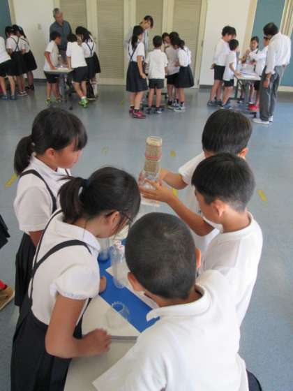 見学の最後に、8つのグループごとに、ペットボトルを使った装置で、浄水の仕組みを実験を通して、確認しました。