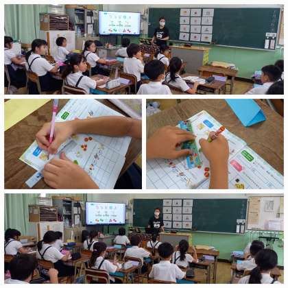 英語表現をよく聞いて、教科書の絵を線で繋いでいます。
