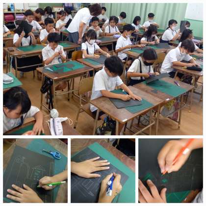 はさみとカッターナイフを使って、町並みを切り抜いていきます。