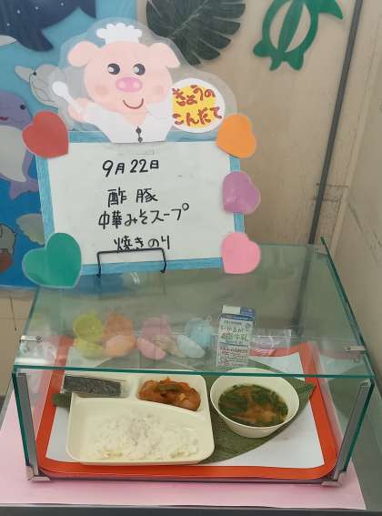 今日の献立にある「酢豚」は、下味を付けた角切りの豚肉に衣を付けて油で揚げ、甘酢あんをからませた中華料理です。
