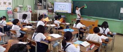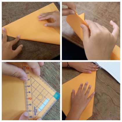 直角が4つ、辺が4つ、4つの辺の長さが同じと図形の性質について確認しています。