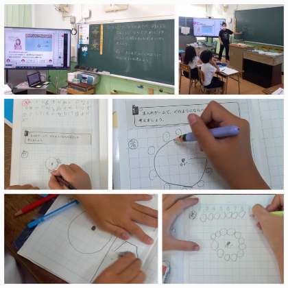 子ども達は、図を描いて「玉入れゲームでどのように並べばよいか」を考えています。
