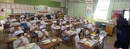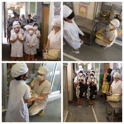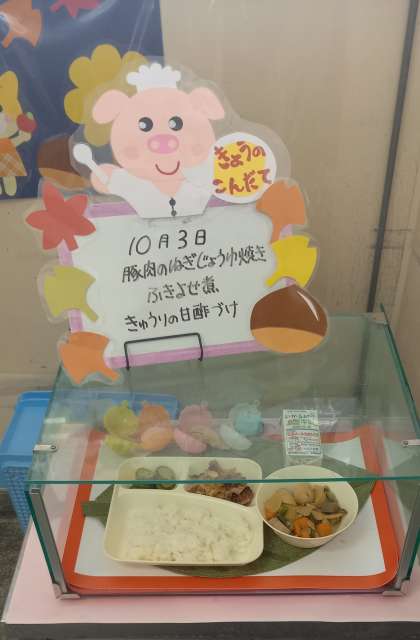 給食では、鶏肉、こんにゃく、里芋、人参、玉葱、蓮根、三度豆、しめじが使われていました。