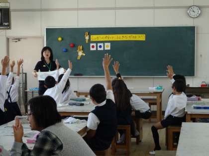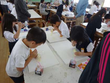 10月13日(火)の2時間目、2年1組で図画工作科の授業研究を行いました。(本校では、図画工作科の研究を進めて3年目となっています。)題材名は「行ってみよう、シャボンの国へ!お話の国へ!」です。赤、青、黄の3色の色つきのシャボンの泡を、大きな画用紙にうつしとる表現活動です。乳飲料の容器に入ったシャボン液に、ストローで息を吹き入れ、ブクブクと泡をつくります。その泡を様々な方法で、画用紙にうつします。「いろんな色がまざってきれいだね。」「がようしがあわだらけだ!」「うらから、見てもきれいだよ!」など、偶然にできた泡の表現を楽しんでいました。次の学習では、できた形から「何にみえるだろう!」と見立て活動を行い、パスなどを使って、自分が考えた「お話の国」づくりへと進んでいきます。できた作品は、11月の「瓜東作品展」でも、展示する予定です。続きは作品展でご覧ください。