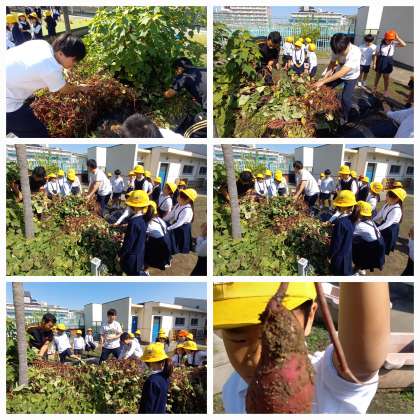 先生と子ども達が協力して、大きなサツマイモのつるを引っ張っています。
