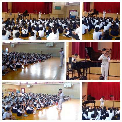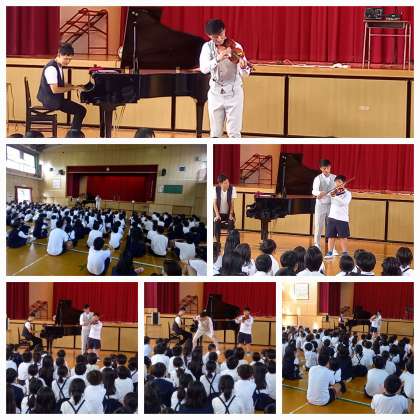東京都小金井市観光大使のEverly(エバリー)から、バイオリン・歌の松尾賛之さんとピアノの松尾悟郎さんの2名が、瓜破東小学校の子ども達のために、素敵なミニコンサートをしてくださいました♪