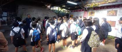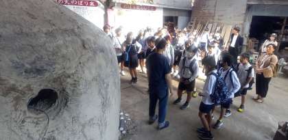 宗陶の「のぼり窯の歴史」や、「のぼり窯での仕事」について説明を聞いています。