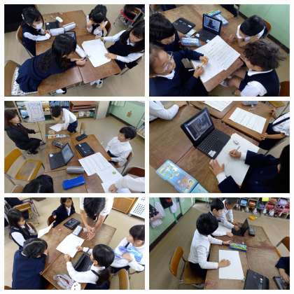 町たんけんでのインタビューの様子を振り返って、発表原稿を書いています。