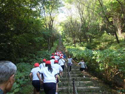 10月16日(金)、3・4年生が秋の遠足で、二上パークに行きました。近鉄「二上神社口」駅を降りて、豊かな自然の中を歩いて行きました。公園に着くと、荷物を置いて、いよいよ頂上を目指して出発です。子ども達は、数を数えながら、456段の急な階段を、20分ぐらいで登って行きました。最後の方は、壁を登るような急な傾きでした。