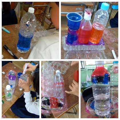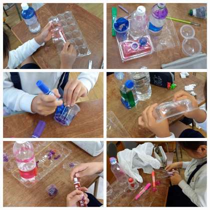 プラ容器が、みるみるステキな作品に変身しています。