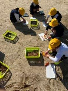秋になって色づいた葉っぱやどんぐり・松ぼっくりを並べました。