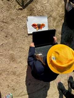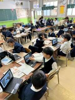 タブレットで写真に収めた作品について、グループの友達と見せ合いながら話しました。