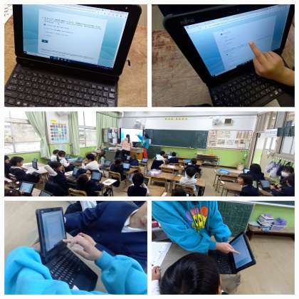 1年生が学校生活アンケートを、タブレット端末を使ってやっています。