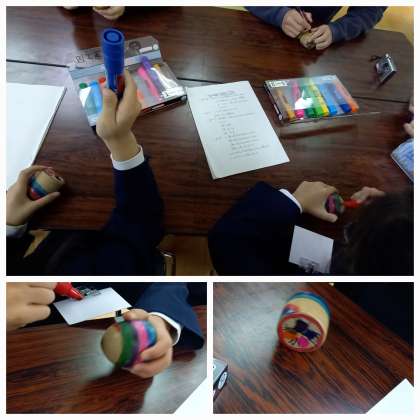 今日の活動では、『ペンイ(伝統コマ)』に、カラーペンで模様を描きました。