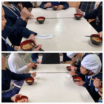 どの班も具材が早く煮えないかとお玉でくるくる回していました。