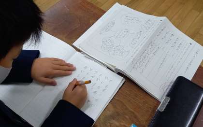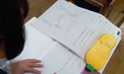 紙の中心にキーワードを書き、そこから連想する言葉を広げていく「ウェビングマップ」をもとに、子ども達は詩を書いています。