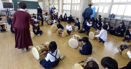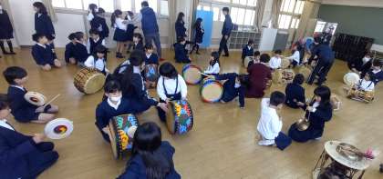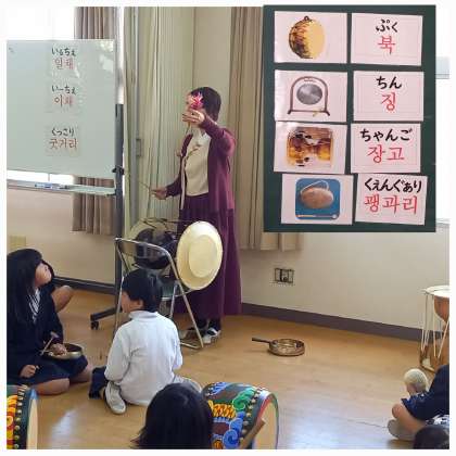 ソンセンニムから韓国・朝鮮の楽器の演奏の仕方を教えてもらい、みんなで楽しく演奏しました。