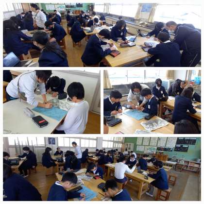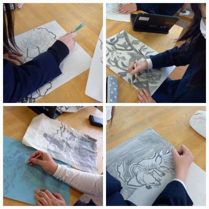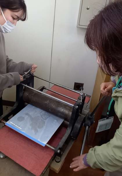 下絵をかいた紙に、石鹸水を吹き掛け圧をかけると・・・