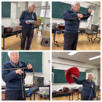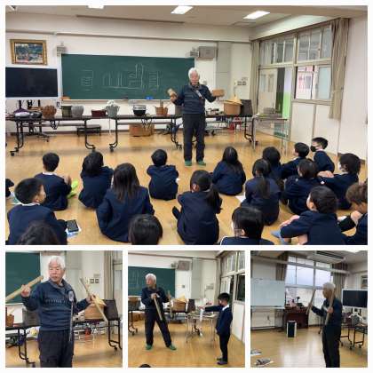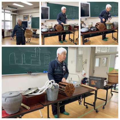元大阪市立小学校長の粕谷先生を講師にお招きしての『昔の道具』の出前授業に、3年生が参加しました。
