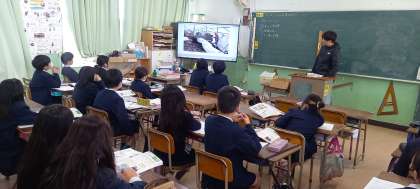 映像を見ながら、ぶどう農家の工夫や努力について考えています。