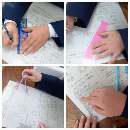 定規や三角定規、コンパスを使いながら問題に取り組んでいます。