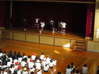 前跳び、後ろ跳び、かけ足跳び、あや跳び、交差跳び、サイドクロス、二重跳び、ハヤブサ、三重跳びなどの個人で跳ぶ技で、次々に跳んでいきました。上級生の巧みな技に、子ども達からは、大きな拍手があがっていました。