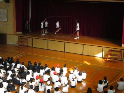最後に、集団で、8の字跳びや、ダブルダッチなどの技も紹介されました。今回のスポーツ委員会の子どもたちの様々な跳び方を見て、学校全体で一層、なわとびへの関心が高まっていくことでしょう。