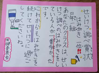 毎週、保健委員会が各学級で行っている『清潔調べ』の結果を賞状にしました。