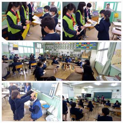 たてわり班で集まり、6年生へ感謝の気持ちを伝えたり、お別れカードと手作りメダルを贈ったりました。