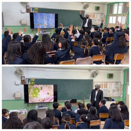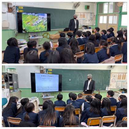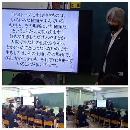 環境問題の改善を図るため環境教育やESDを手段とし、自然環境の保全再生創出の課程で生物多様性に寄与しながら、豊かなまちづくりに繋げることを目的として活動しているbioaより、瀬口様に来ていただき「ビオトープ」についての出前授業をしていただきました。