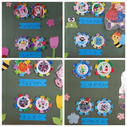 教室の壁面には、春・夏・秋・冬の行事を2年生が描いた作品が掲示されています。