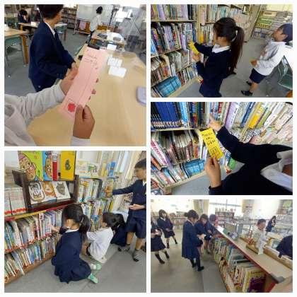 主幹司書からの指令をうけ、子どもたちは本を探しています。