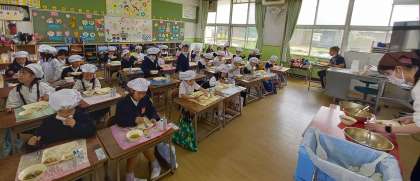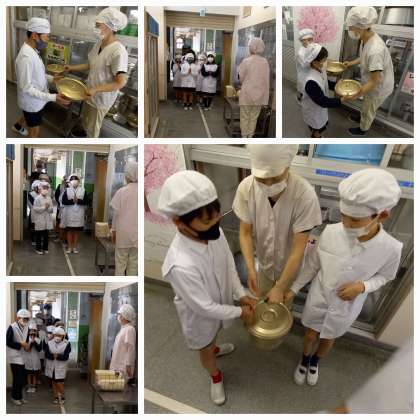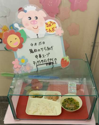 給食当番は、展示食を見て「やったあ。からあげ!」と喜んでいました。