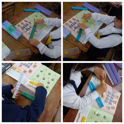 教科書の挿し絵にブロックを置き、数の確認をしています。