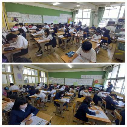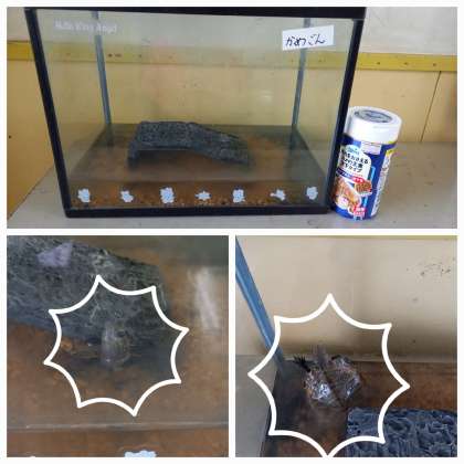 クラスで世話をしている、カメのかめごんが教室後方からみんなを応援しています!