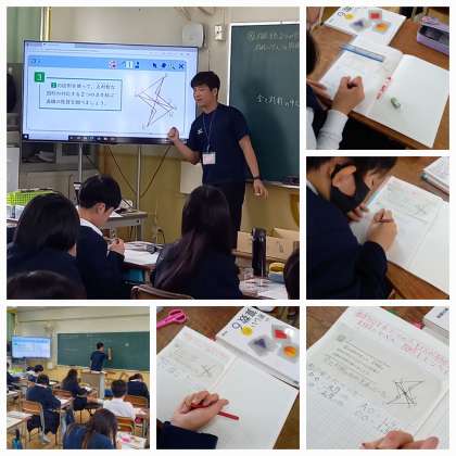 点対称な図形の対応する2つの点を結ぶ直線の性質について調べています。