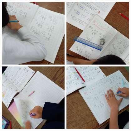 繰り上がりの計算では、小さな数字を書き、計算ミスをしないように工夫しています。