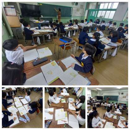 場面や登場人物の様子によって、どんな声色がいいのか、どんなテンポで読むのがいいのか、グループで音読の工夫を考えます。