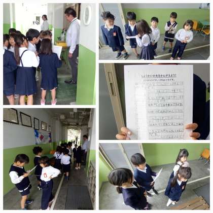 4月にお兄さんお姉さんになった2年生が、1年生の手を引き、がっこうたんけんをしています。