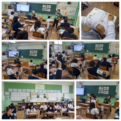英語音声を聞き、登場人物の好きなものや苦手なものを教科書に書き込んでいます。