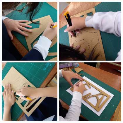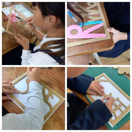 自分の名前をデザインした段ボールを、カッターナイフで切り抜いています。