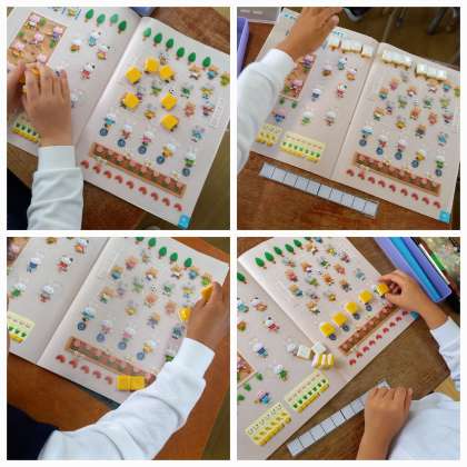 ブロックを使って、教科書の挿し絵から、同じ数のなかまをさがしています。