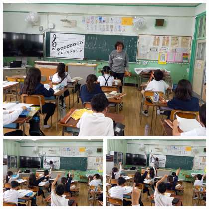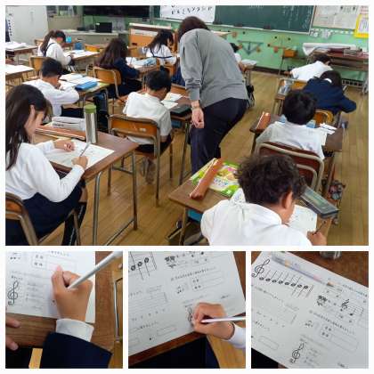 ト音記号🎼の書き方を、先生と一緒に空がきしたあと、プリントで練習しています。
