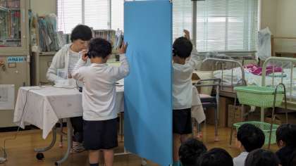 養護教諭の説明をしっかり聞いて検査をしていました。
