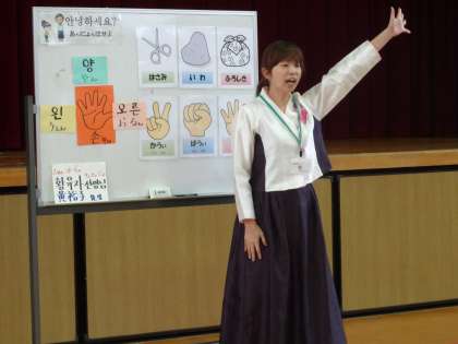 今回の学習は、黄ソンセンニムをゲストティチャーにお招きしました。まず、ソンセンニムは、1年生の子ども達に、あいさつの言葉を紹介しました。日本語のあいさつでは、時刻によって、「おはよう」「こんにちは」「こんばんは」と変わっていくのですが、韓国・朝鮮では、時刻に関係なく「アンニョンハセヨ」というあいさつをするそうです。
